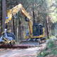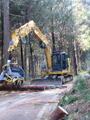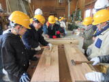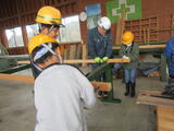 総合的な学習「未来のキャリアを考えよう」の一環として、立山山麓森林組合さんのご協力のもと、林業体験をさせていただきました。まずは、バスの中から、ハーヴェスターという重機で間伐をしている様子を見ました。ハーヴェスターのアームについている爪のような手が、器用に樹木をつかみ、それと同時にすごいスピードで太い木を切っていました。そして、アームを横に動かすと同時に枝葉を切り落としながら、同じ長さになるように木を切っていました。次々と丸太が出来上がっていく様子は、とても圧巻で、普段見ることができない貴重な体験ができました。その後木材加工場に入り、のこぎりや釘打ちを体験させてもらい、丸い木を使ったコースター作りもしました。