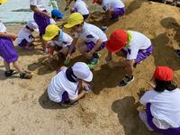 1年生は図工「すなとなかよし」の学習をグラウンドの砂場で行いました。